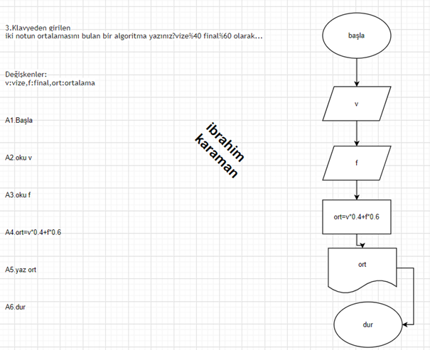 3.Klavyeden girilen iki notun ortalamasını bulan bir algoritma yazınız?vize%40 final%60 olarak...